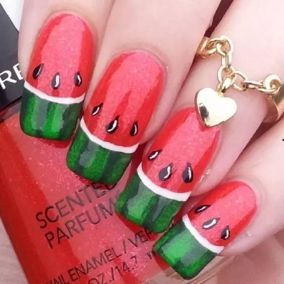 5. 用美甲油涂抹整个指甲,打造出完美的吃瓜酱美甲效果。